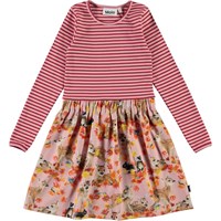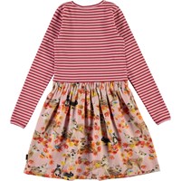 Credence is a long sleeve dress in two parts: The top is in pink and red striped rib. The skirt is pink with a print of deer, rabbits and golden leaves.