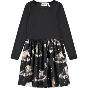 Black long-sleeved dress made of organic cotton, combining a close-fitting top in ribbed jersey with a smooth jersey skirt. The dress is easy to put on and has plenty of room to play and move. The skirt has a print of unicorns and flowers.