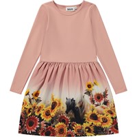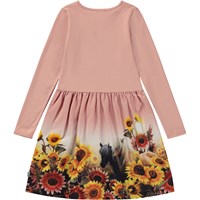 Pink, knee length dress with long sleeves and a flower and pony print. The print shows two ponies that are enjoying life together in a field full of sunflowers. This dress is in 100% cotton jersey, has a round neck, long sleeves, sewn on skirt with a print and is in a regular fit.