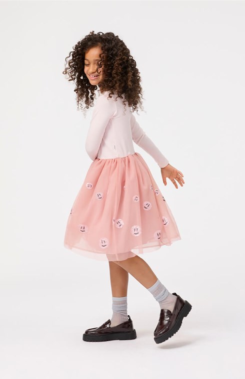 Pink long-sleeved dress with a pink tulle skirt and smiling sequin faces. The top is snug in ribbed cotton jersey with a round neck, the skirt reaches the knee and has a cotton underskirt.