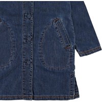 Hana is a long blue denim jacket with a button closure on the front. The jacket has patch pocket on the front and slits at the sides.