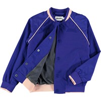 Sporty blue college jacket with a crispy texture. The jacket has buttons down the front, side pockets, striped rib at the neck, sleeves and bottom. It has a lovely embroidery on the back.