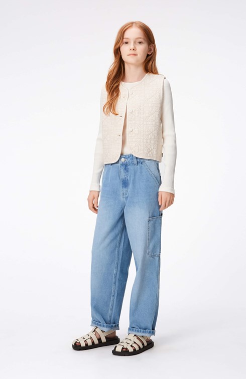 Sand coloured, lined waistcoat in quilted cotton. It has a round neck, a button front closure and an edge tape at the armhole and all the edges to create a refined finish. Squares with clovers form the beautiful quilting pattern on the waistcoat.
