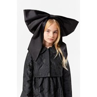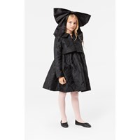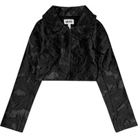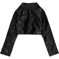 Black bolero jacket in a jacquard weave with a large collar featuring a ruffled edge, long sleeves, and a buttoned placket with invisible buttons. The jacket is voluminous and has delicate leaves woven into the fabric, giving it a sophisticated and luxurious appearance. Pair the jacket with a matching dress for a complete and elegant ensemble.