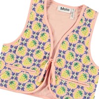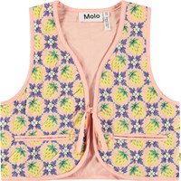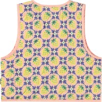 Light orange waistcoat in quilted cotton with small piped pockets. The waistcoat has a round neckline, ties at the front, and binding at the armholes and all around the edge, giving a nice finish. The quilted pattern of the waistcoat consists of small squares with a multicoloured print of yellow strawberries and flowers, blending together in a beautiful pattern.