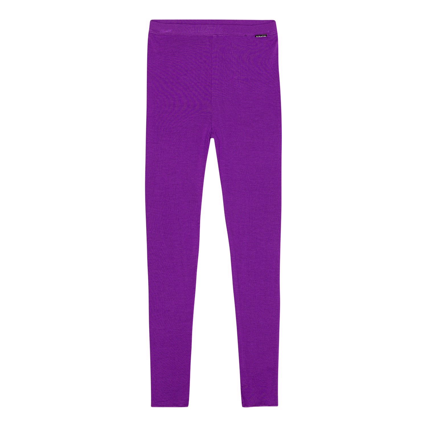 Purple leggings in stretchy, soft viscose. They have an elastic waist and a small logo on the front with the words 'More love'. They are snug fitting, comfortable and easy to pull on.