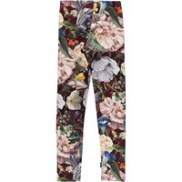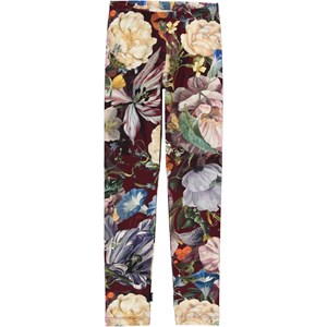 Molo's classic long leggings in dark purple with a large floral print. They are constructed in a stretchy cotton blend, and the elastic waist ensures a good fit.