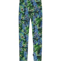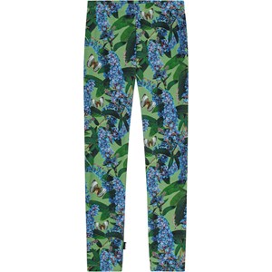 Green leggings in organic cotton with a snug fit and an elastic waistband for comfort and easy dressing. The print is an all-over print of blue-purple butterfly bushes with vibrant flying butterflies. Leggings are perfect for styling under dresses, skirts, and oversized sweaters for a comfortable and trendy look.