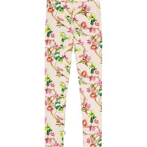 Off-white leggings in organic cotton with a snug fit and an elastic waistband for comfortable and easy dressing. They feature an all-over print of Christmas roses in white and light pink shades, gracefully intertwining with their green leaves. These leggings are perfect for styling under dresses, skirts, and oversized sweaters for a comfortable and fashionable look.