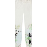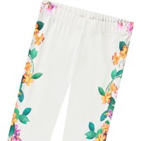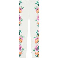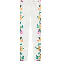 White leggings in stretchy organic cotton with an elastic waistband. The soft leggings are snug-fitting with a print of colourful flowers crawling up the sides of the legs.