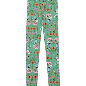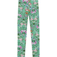 Green leggings in organic cotton. They are snug fitting, comfortable and easy to pull on. The leggings are in a multi-coloured, all over print of hearts that are formed by insects and multi-coloured wildflowers.