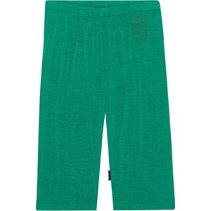 Green bike shorts in soft, elastic viscose. The shorts are knee length and have an elastic waist and a small logo on the front with the text, 'More love'. They are snug fitting, comfortable and easy to pull on and off.