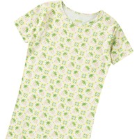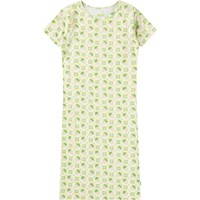 Off-white nightdress with t-shirt sleeves in organic cotton jersey. The nightdress is knee-length, form-fitting, and comfortable to wear in the stretchy cotton material. The nightdress features an all-over print of pink strawberries and white flowers that blend together in a beautiful pattern.