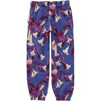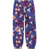 Blue jogger in an all over pink and fuchsia floral print. The print has a clear blue background and is made up of pink autumn leaves and night blooming Angel Trumpets, which blooms at night, not during the day like other flowers. In this print, the flowers are bathed in moonlight as they open their petals while the rest of us are sleeping. These joggers are in 100% cotton, have elastic and inner ties at the waist, a back pocket, elastic at the ankles and are in a regular fit. Wear these joggers with the matching sweatshirt, Marge, in the same print for a super cool set.