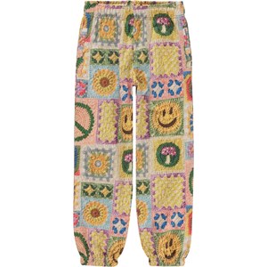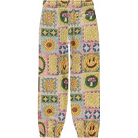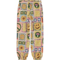 Multi-coloured joggers in an all over crochet print. Molo has been crocheting on this print, creating its own interpretation of a popular trend. You can spot rainbows, smiley faces, mushrooms, sunflowers and peace signs. Pull out your own crochet hooks and start crocheting in your own colours and patterns. Let your imagination run wild! These joggers are in 100% cotton, have elastic and inner ties at the waist, a back pocket, elastic at the ankles and are in a regular fit. Wear these joggers with the matching sweatshirt, Marge, in the same print for a super cool set.