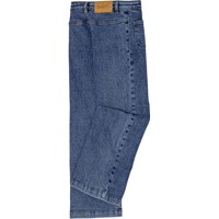 Denim blue 70s jeans in organic cotton with stitched crease. The trousers have a snap button and zipper closure, belt loops, and an adjustable button inside the waist for a good fit. They have a flared silhouette and sewn-on pockets on the front.