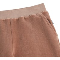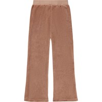 Brown velour trousers with a flared design made of soft, organic cotton. They have side pockets, a wide elastic waistband, and an internal drawstring for easy fit and good comfort.