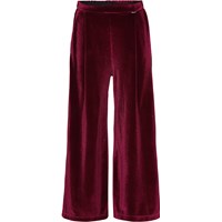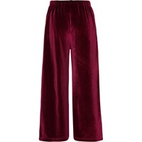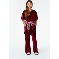 Alfa is a pair of dark red velour trousers in a loose fit. They have an elastic waist. Wear the trousers with a matching top.
