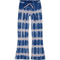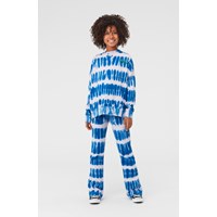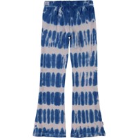 Alfreda is a pair of sweatpants with a tie-dye print in blue and pink. They have a slight flare in the legs and an elastic waist with ties.