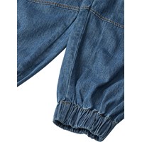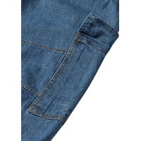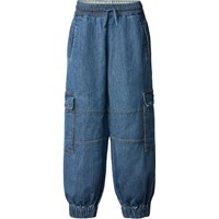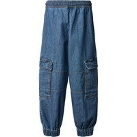 Dark blue cargo trousers made of organic cotton chambray in a loose fit. The trousers have an elastic waist with drawstring, side pockets, cargo pockets on the thighs, and elastic at the ankles for a sporty finish.