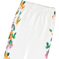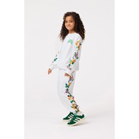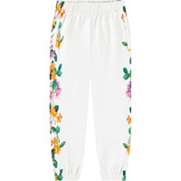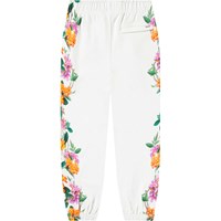 Organic cotton sweatpants. The sweatpants feature an adjustable elastic waist, side pockets, a single back pocket, elasticated ankles, and a regular fit. It is white with jungle flower print down the sides. For a complete outfit, pair with a matching sweatshirt.