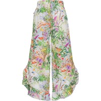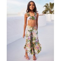 Long, airy trousers in a multi-coloured, all over print in lightweight, 100% organic cotton. The print is of a beautiful frenzy of flowers with butterflies. The trousers have an elastic back waist and curved, ruffle edged legs with slits at the sides to make them easy to slip on and to wear over swimsuits. This style is in an oversized fit. For a more snug fit, or for a child who is between two sizes, we recommend buying one size down.