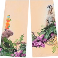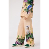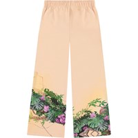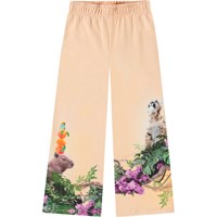 Light orange jersey pants made from organic cotton. The pants have a loose fit and elastic waist for easy dressing and comfortable fit. It has a jungle animal prints along both legs. Pair with matching sweater Maxi for a complete and soft set.