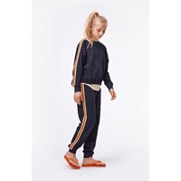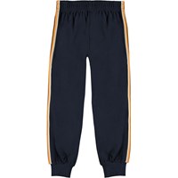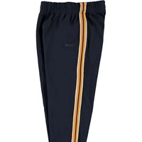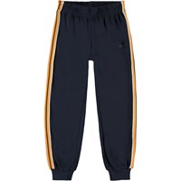 Ava is a pair of blue sweatpants with a striped band down the sides of the legs. They have elastic at the waist and legs.