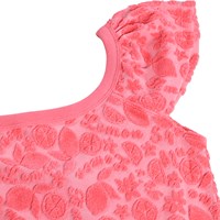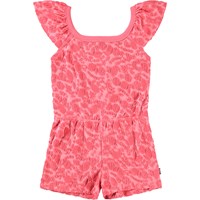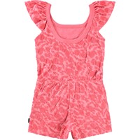 Short light pink jumpsuit with a citrus pattern made of soft cotton terry. The suit has short sleeves, elastic at the waist, a deep cut at the back, and a length to mid-thigh.