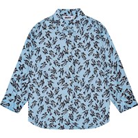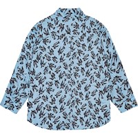 Classic light blue shirt in a soft and lightweight viscose. The shirt has a loose fit, collar, and mother-of-pearl buttons for closure. The sleeves have a cuff with a button fastening that matches the buttons on the front. The shirt features an all-over print of black birds flying on a light blue background.