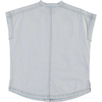 Rae is an oversized, sleeveless denim shirt in light blue. It has front pockets and button closure.
