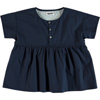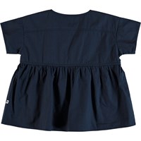 Rania is an oversized, dark blue poplin top with short sleeves. Rania has a button closure at the neck is bell shaped at the chest.