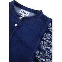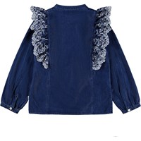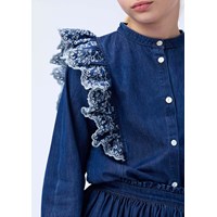 Long-sleeved loose denim shirt made of organic cotton. The shirt has a mandarin collar with a small ruffle edge, small mother-of-pearl buttons and an elegant ruffle edge at the shoulders that extends both in front and around the back. The ruffle edge features beautiful white embroidery. The sleeves have a small cuff with a slit and button closure.