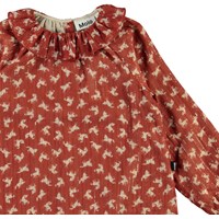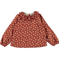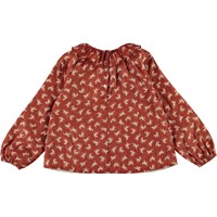 Rayanne is a brown woven shirt with small woven horses and glitter. It has a zip closure at the neck and a small ruffle collar.