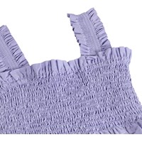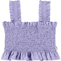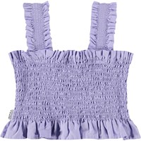 Purple crop top made of soft cotton with smock effect, ruffle edges, and wide straps.