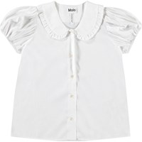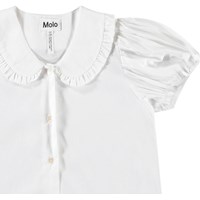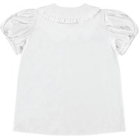 White shirt t-shirt in soft viscose. The shirt has a button closure at the front, an elegant collar with a small ruffle around the edge. The sleeves have elastic cuffs and are gathered at the shoulder, giving the sleeves a voluminous look.