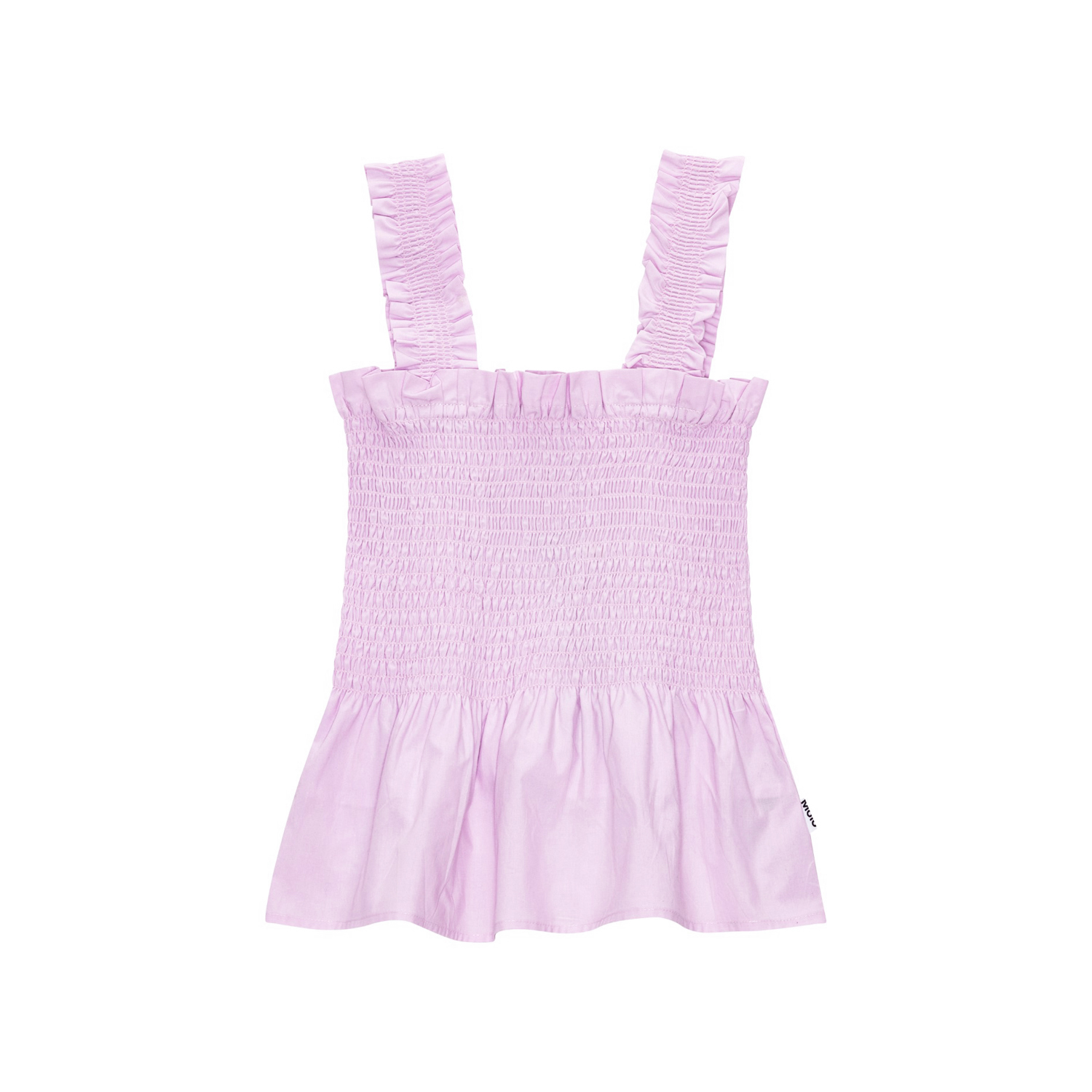 Pastel pink top in organic cotton. The top is in a snug fit with lovely ruffle straps and an elastic, smocked chest that creates a voluminous effect at the bottom.