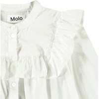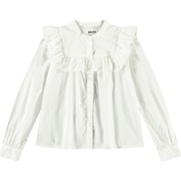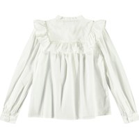 White shirt in organic cotton with mandarin collar. The shirt has a loose fit, ruffle detail, button closure at the front and at the cuffs.