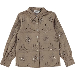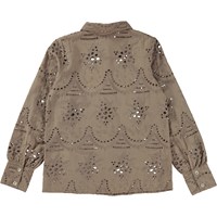 Beige shirt in all over broderie anglaise. This shirt is in 100% cotton, has long sleeves, a collar, a button front closure with white buttons and is in a regular fit. Wear it with the Biana skirt in the same colour and fabric for the perfect set.