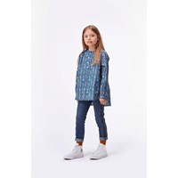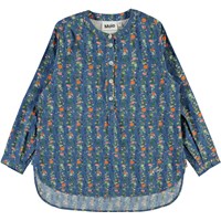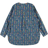 Runaris is a blue oversized shirt with a print of vertical flower chains. The shirt has buttons at the collar and is slightly longer in the back.