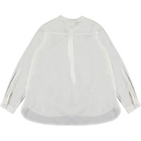 Runaris is a long sleeve, white poplin shirt with a button closure.