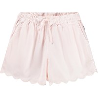 Pink, loose shorts made of organic cotton. The shorts have decorative wavy edges, fine embroidery details, side pockets, an elastic waist with a drawstring, and a roomy fit.
