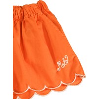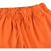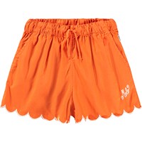 Orange, loose shorts made of organic cotton. The shorts have decorative wavy edges, fine embroidery details, side pockets, an elastic waist with a drawstring, and a roomy fit.