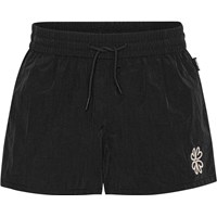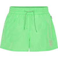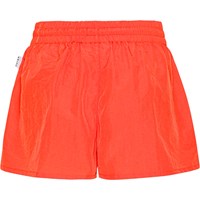 Sporty, red nylon shorts. They have a white, embroidered clover logo as well as side pockets and a wide elastic waist with a drawstring that makes them easy to pull on. It's ok to get the shorts wet because they dry quickly.