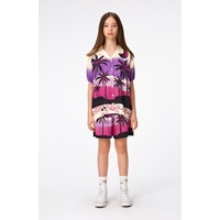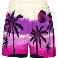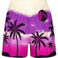 Knee length shorts with a print of a desert island in shades of purple, pink and black. The viscose quality creates a beautiful drape. The shorts have an elastic waist that makes them comfortable and easy to pull on.