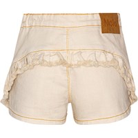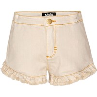 Off-white denim shorts with a ruffle detail. The shorts are in a comfortable fit with a button and zip closure. They have a button on the inside of the waistband so they can be adjusted. There's a raw ruffle edge on the front that continues onto the back, on the high part of the seat.