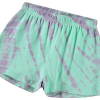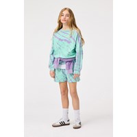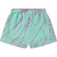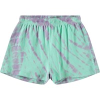 Shorts in organic cotton. These shorts have a loose fit and elastic waistband. It is coloured in purple and turquoise tie-dye.