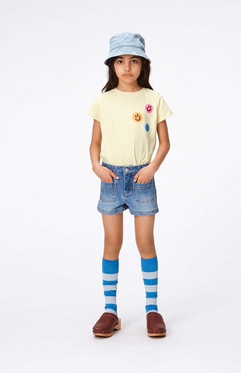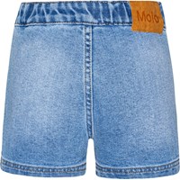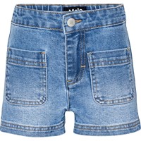 Blue denim shorts with patch pockets on the front. They have a snap and zip closure as well as elastic at the back waistband that makes them comfortable and easy to pull on.