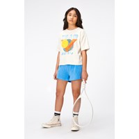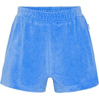 Sporty, blue shorts in soft cotton terry. They are in a loose fit, have side pockets and a wide elastic waist with a drawstring that makes them easy to pull on. Cotton terry is extremely comfortable and dries quickly after a swim.