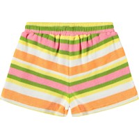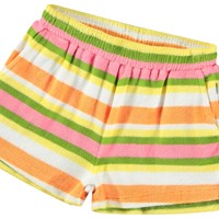 Shorts in soft cotton terry with stripes in yellow, green, pink, white, and orange. The shorts have a loose fit, side pockets, and a wide elastic waistband that makes them easy to put on and comfortable to wear. Cotton terry is comfortable to wear and dries quickly after a swim.